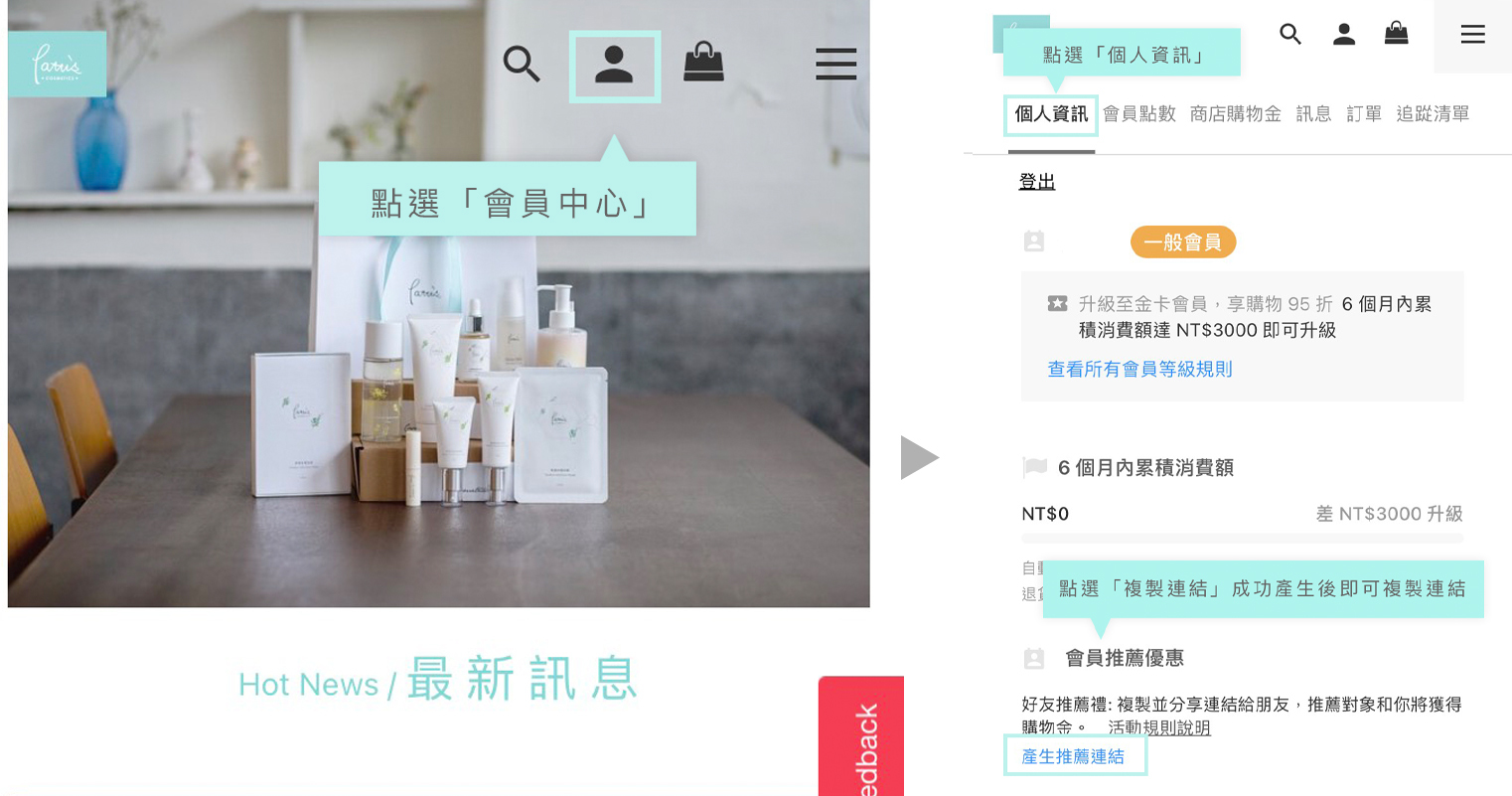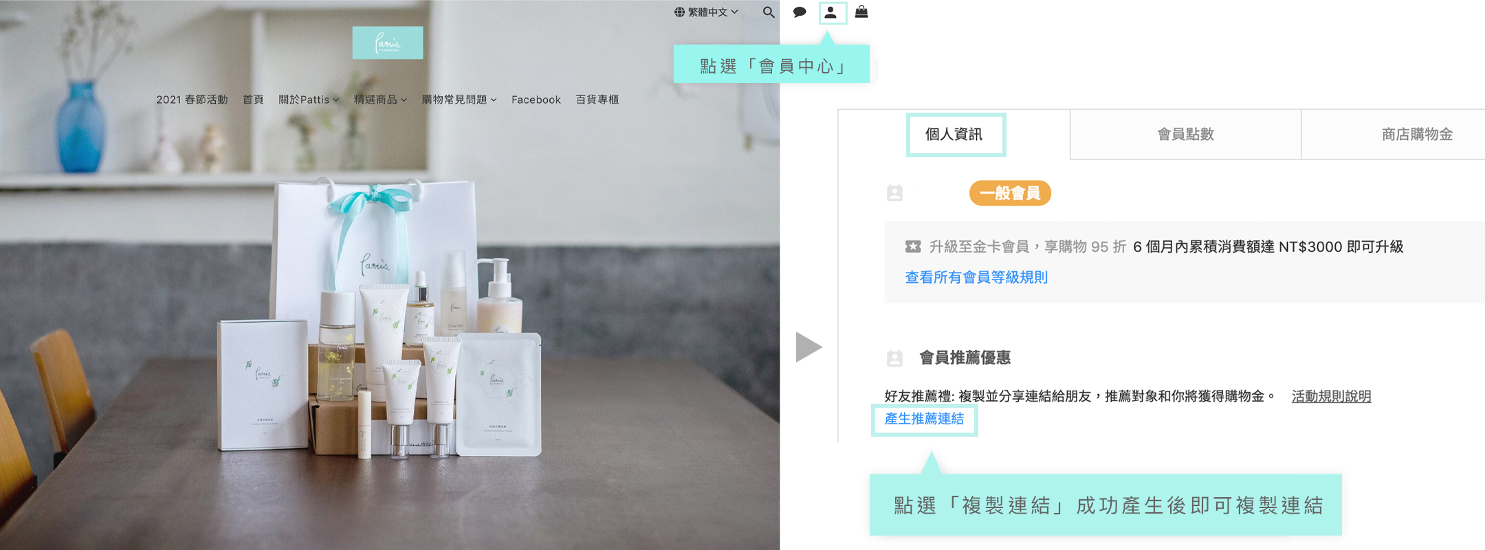 ・步驟一:登入Pattis官網後,點選「會員中心」的「個人資訊」,找到「會員推薦優惠」,點選「複製連結」,即可成功複製會員推薦連結。