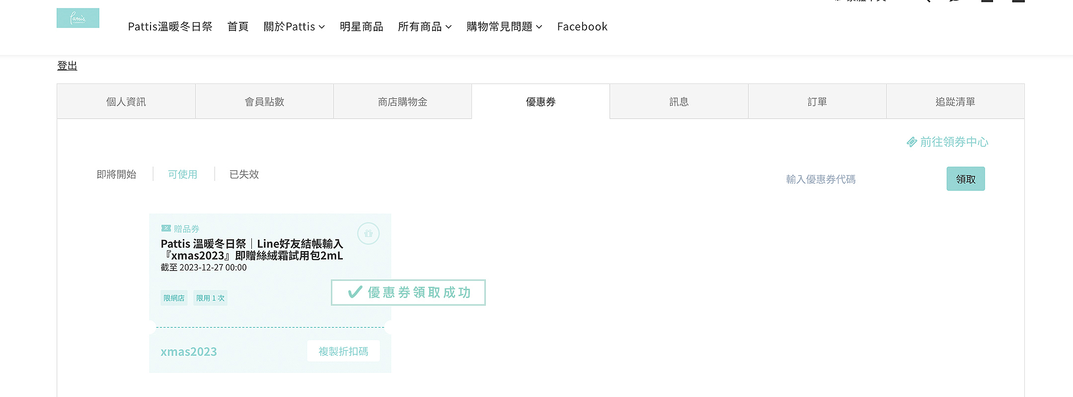生日當天Pattis會發送100元購物金至會員帳戶。(無使用期限)