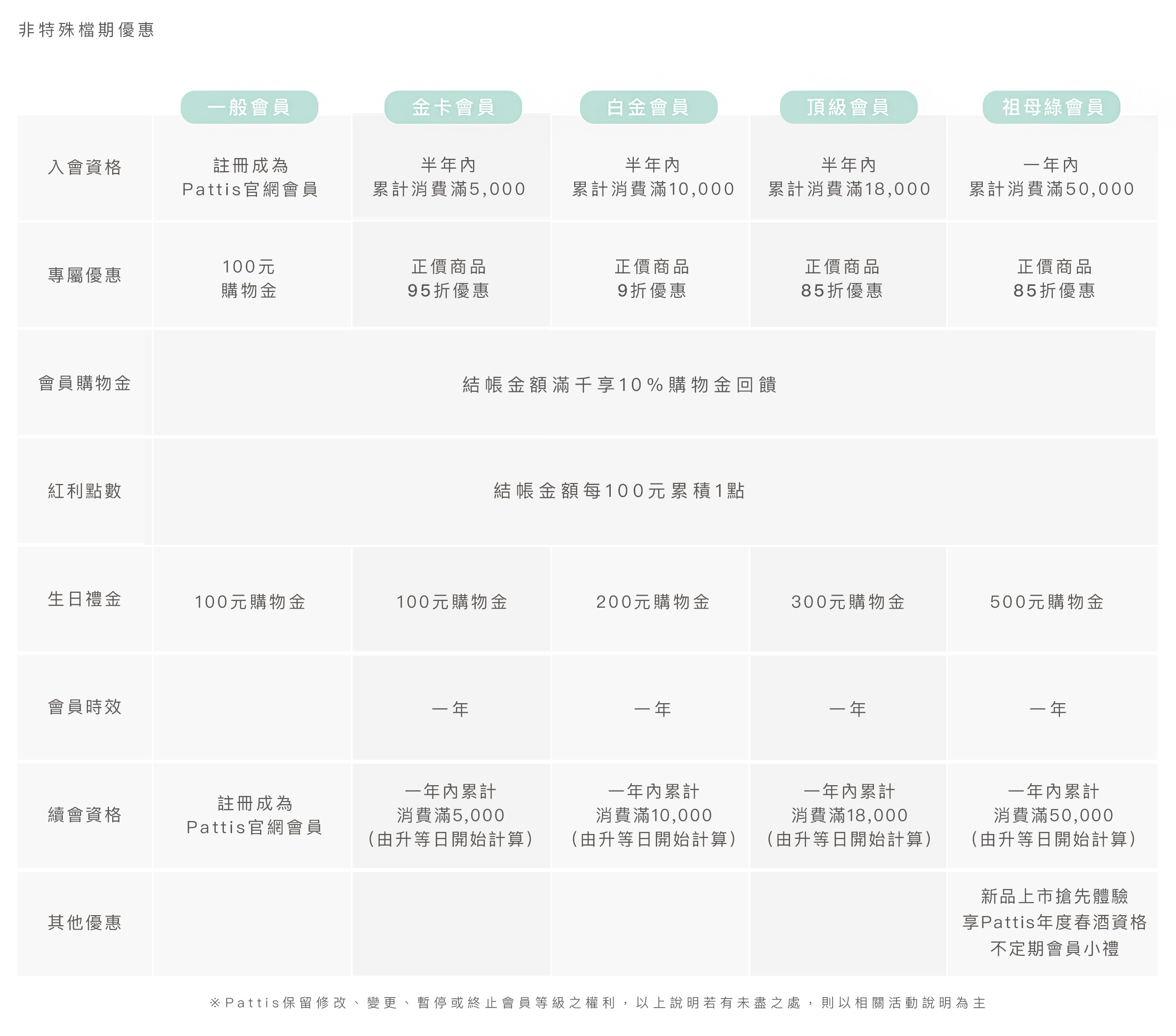 • Pattis官方網站會員制度,系統會隨著消費紀錄及消費累積金額變動,來判斷每個會員升級的資格。