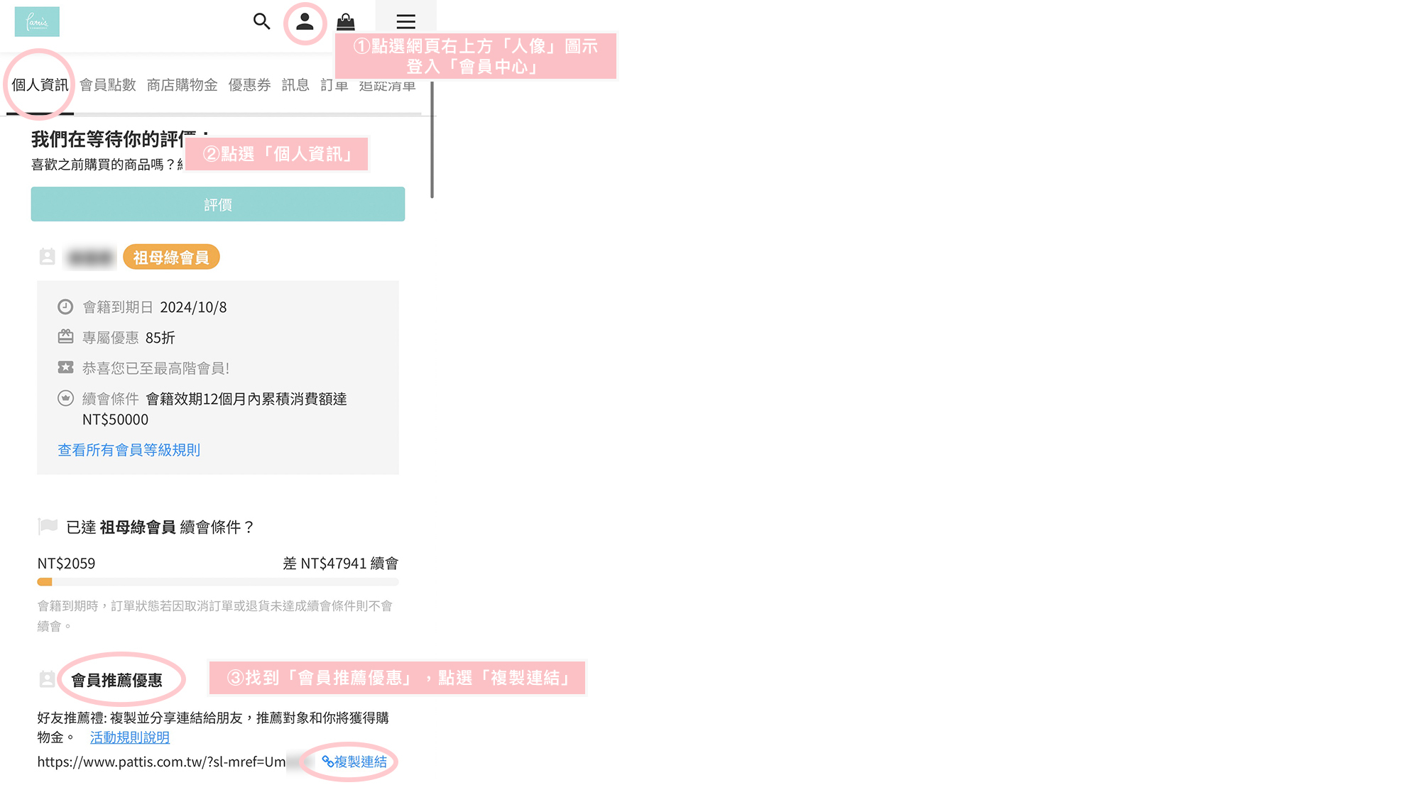1. 點選網頁右上方「人像」圖示登入「會員中心」→「個人資訊」,找到「會員推薦優惠」,點選「複製連結」,即可成功複製會員推薦連結。