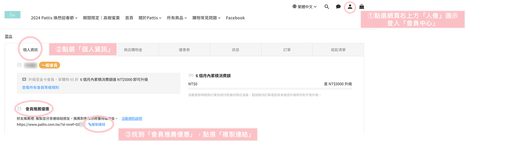 分享「會員推薦連結」給尚未在Pattis消費過的親友,親友點擊連結後,結帳金額滿 $500 並完成訂單,推薦人即可獲得100購物金。