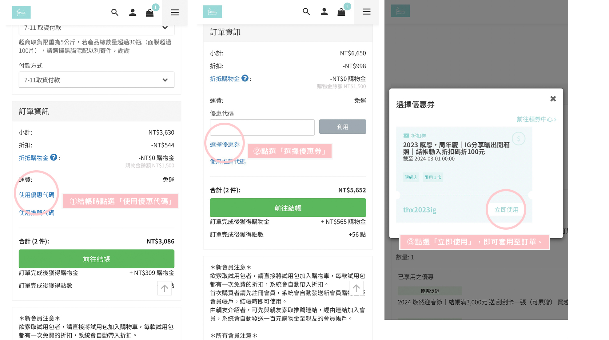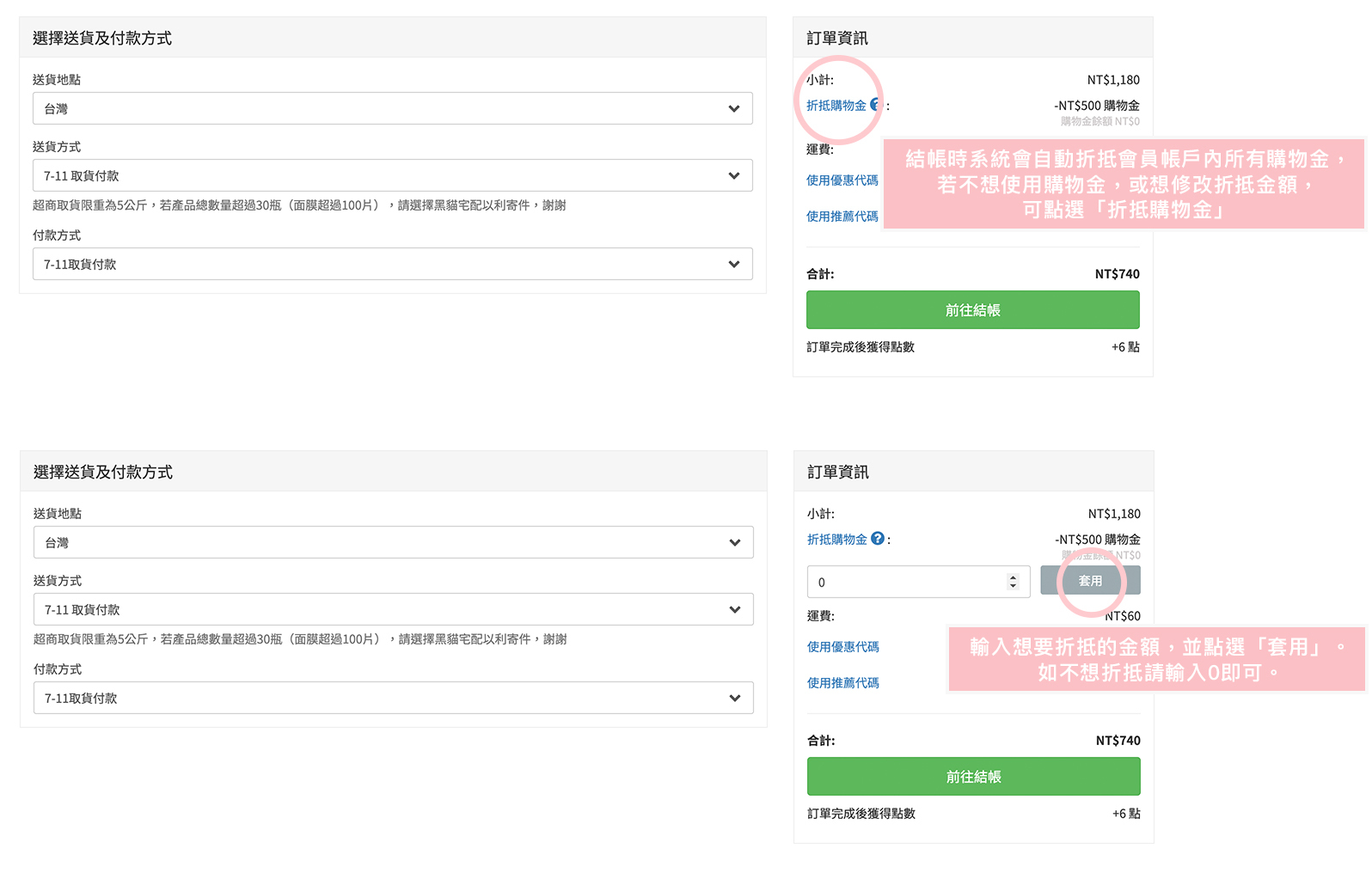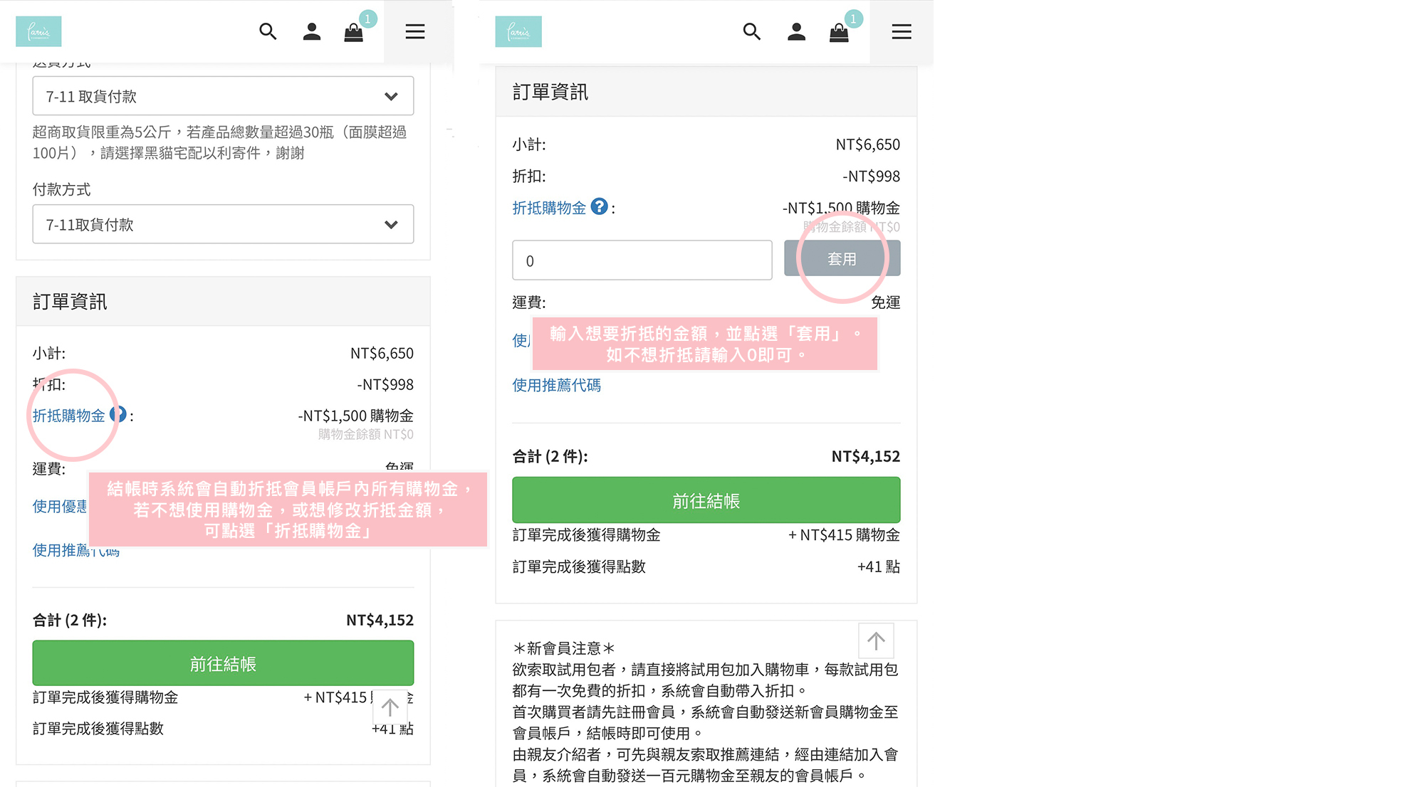 貼心提醒:請務必先加入官網會員後再行結帳。新會員購物金將在註冊後由系統自動發送,如在結帳同時選擇加入會員,系統則不會發送新會員購物金。