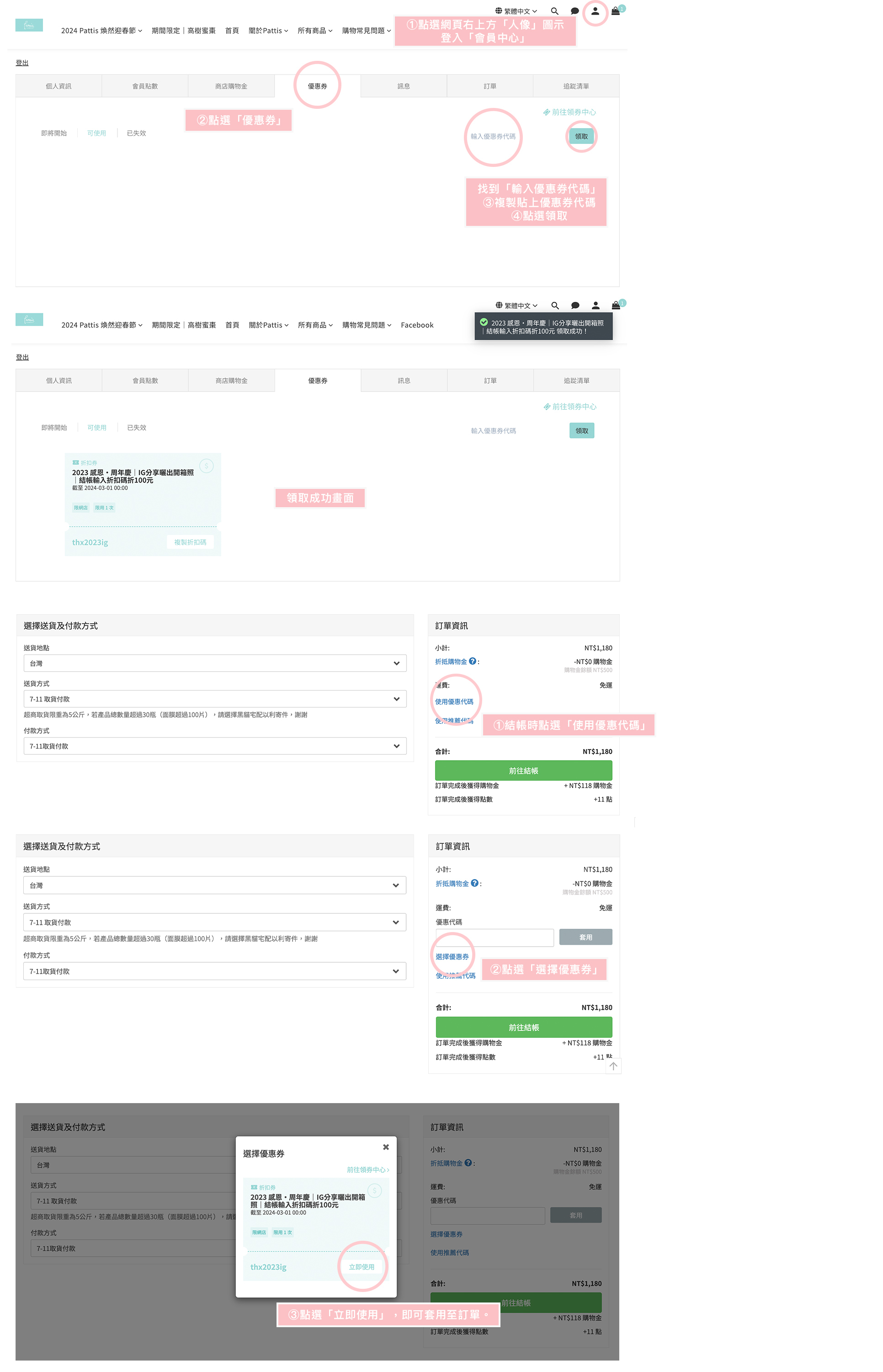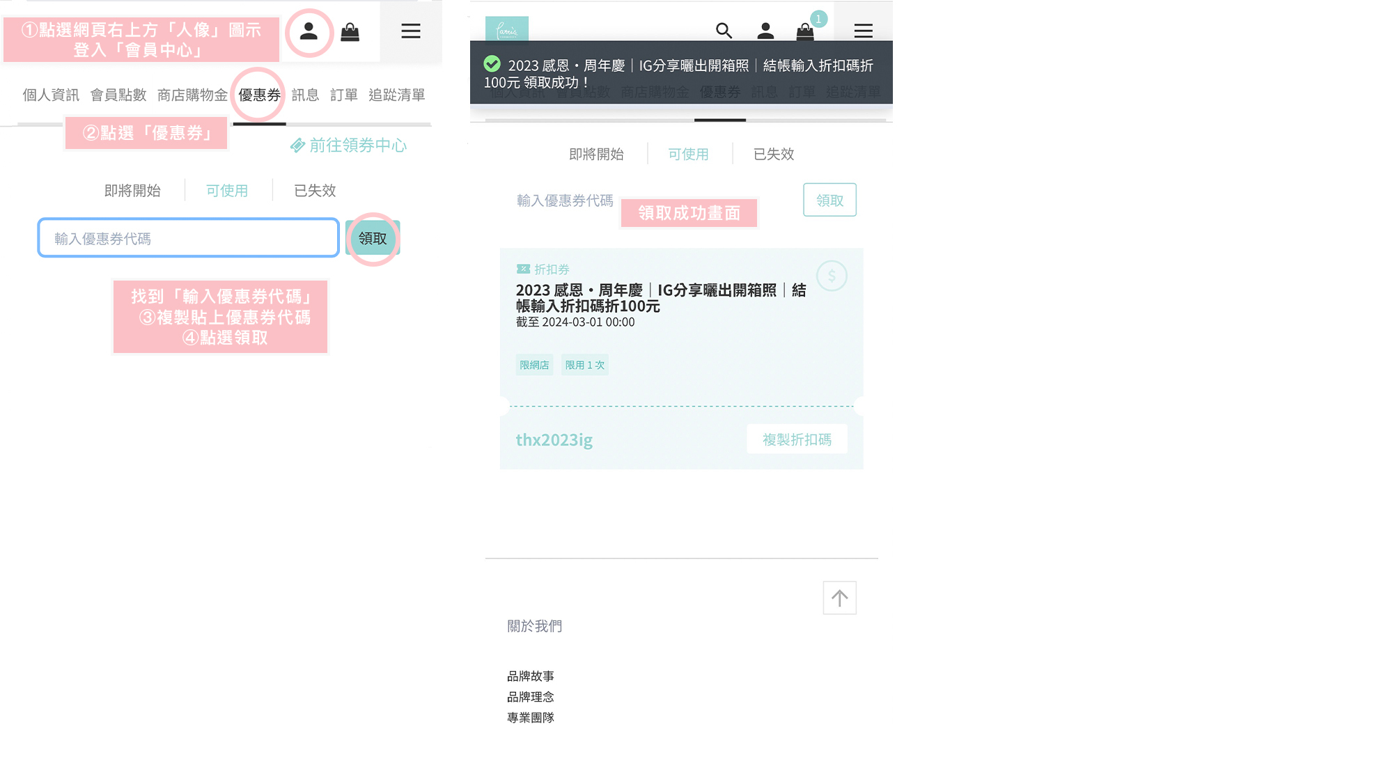 1. 點選網頁右上方「人像」圖示登入「會員中心」→「優惠券」,找到「輸入優惠券代碼」,複製貼上優惠券代碼,並點選領取。