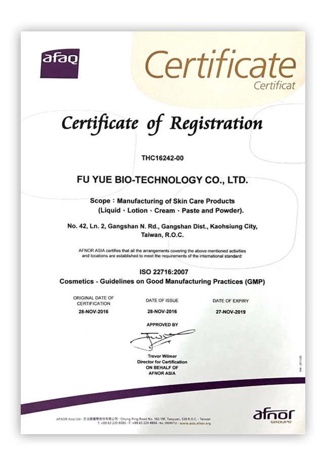 我們的廠房擁有ISO22716 Cosmetics-GMP認證,